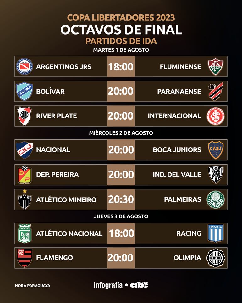 Con el duelo entre el Argentinos Juniors del goleador paraguayo Gabriel Ávalos y el Fluminense del artillero argentino Germán Cano, se pondrá en marcha el próximo 1 de agosto la etapa de octavos de final de la Copa Libertadores 2023.