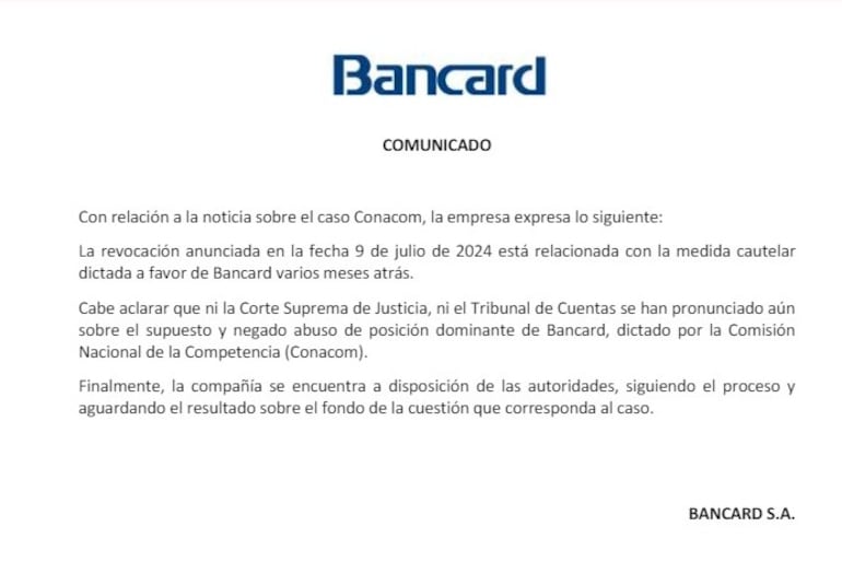 “Cabe aclarar que ni la Corte Suprema de Justicia, ni el Tribunal de Cuentas se han pronunciado aún sobre el supuesto y negado abuso de posición dominante de Bancard, dictado por la Comisión Nacional de la Competencia (Conacom)”, dice parte del comunicado.