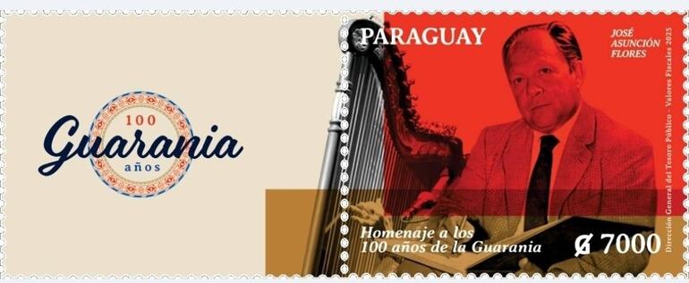 “Homenaje a los 100 años de la Guarania” es la emisión postal que puso en circulación la Dirección General de Correos con un solo valor de G. 7.000. En el sello postal se destaca la figura del maestro José Asunción Flores, cuya imagen constituye el elemento central del timbre junto con el arpa paraguaya, símbolo de la identidad musical de nuestro país. Además, 10 viñetas reproducen el logotipo oficial de Guarania 100 años, aportando unidad y realce conmemorativo al conjunto.