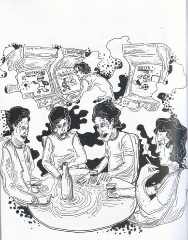 El libro tiene tantas ilustraciones como cuentos, once. Hay que decir que el bajo nivel de la antología no se debe, me parece, a la obligación monotemática de escribir sobre fútbol, que no se trata en este caso de ningún modo de una limitación (a la manera de las restricciones al escribir que se autoimponían los oulipianos para abrir nuevas sendas creativas), sino, pura y simplemente, a carencias –por bisoñería, suponemos– a la hora de narrar una historia. Por eso he decidido titular mi reseña Pelota de goma, pues uno la imagina concebida en horas terciarias, seguramente cuando en el pospartido arden los fuegos fatuos del entusiasmo birrero y vitivinícola. (Escribir borracho, pero corregir sobrio. Hemingway dixit.)