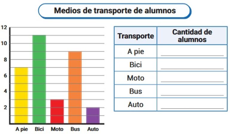1. Completa la tabla con la cantidad de alumnos según el medio de transporte que emplean y responde las preguntas