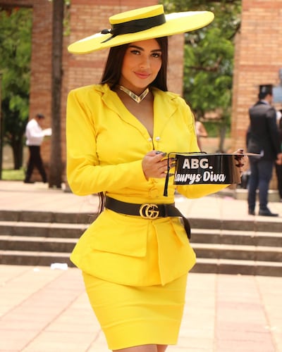La diosa Laurys Dvya, quien siempre llama la atención con sus vestuarios, a los que ella llama icónicos; esta vez también fue el centro de atención al ingresar vestida de amarillo por las escaleras de la Facultad de Derecho para dar su examen final de la carrera que la habilita como abogada.