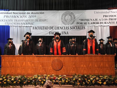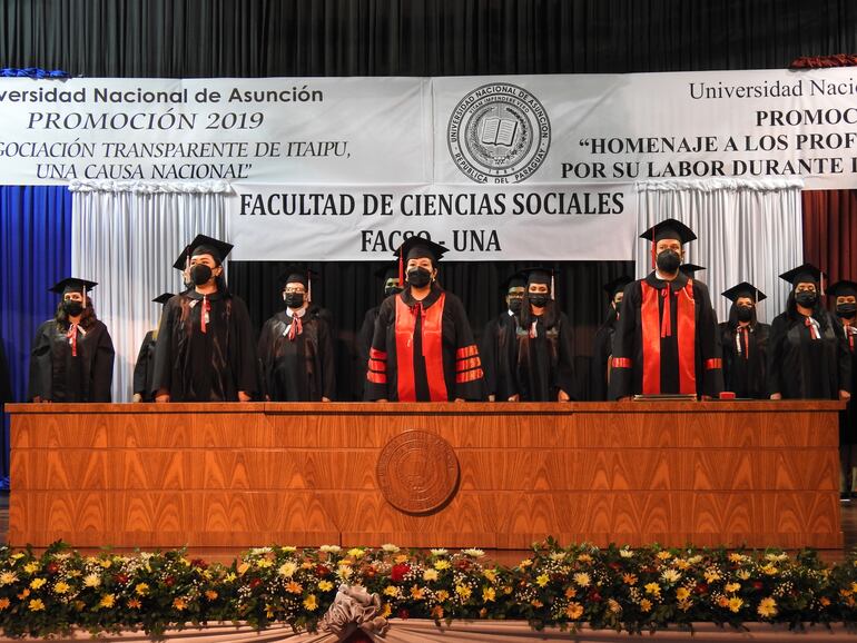 Unos 47 egresados de la Facultad de Ciencias Sociales de la Universidad Nacional de Asunción (FACSO - UNA) participaron ayer del primer acto de graduación luego de la pandemia. Son de la promoción 2019, que hace mención a la “Renegociación transparente de Itaipú, una causa nacional”, y la promoción 2020, como “Homenaje a los profesionales sanitarios por su labor durante la pandemia del covid”.