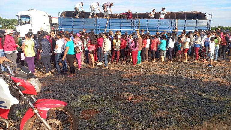 Los menonitas llegaron a la Colonia Sidepar 3000 con un camión de gran porte, con carretas acopladas que estaban repletas de bolsas de víveres, y se colocaron en un punto para repartir los alimentos. Rápidamente cientos de personas se acercaron al sitio y en poco tiempo terminaron vaciando la carga que forma parte de la exigencia para la liberación del secuestrado Peter Reimer.