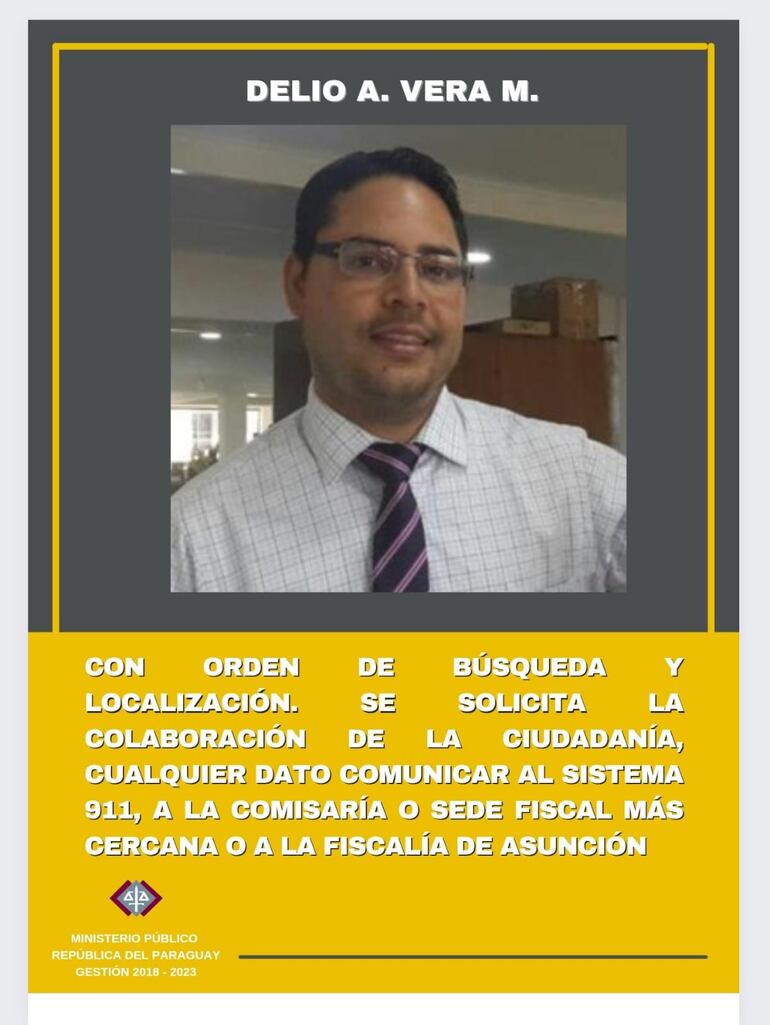 Delio Antonio Vera Moreno, quien se desempeña como defensor público, según informaciones recibidas de parte de la familia, fue visto por última vez ayer, miércoles, a las 14:00, cuando salió de la casa de su hermana, ubicada en el barrio Ciudad Nueva de Asunción.