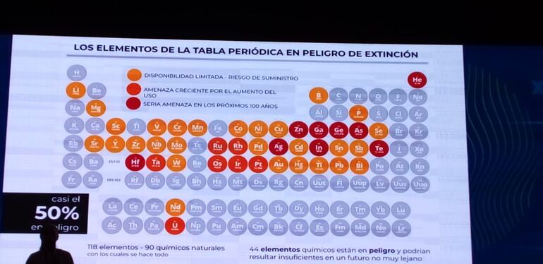 Por otra parte, durante uno de los talleres desarrollados en la segunda jornada, sobre el ambiental, se advirtió entre varias cosas que unos 44 de los 118 elementos de la tabla periódica están en peligro de extinción en un futuro no muy lejano; una parte de los mismos, con seria amenaza de extinción en los próximos 100 años; otra, con amenaza creciente por el aumento del uso y otra porción con riesgo de disponibilidad limitada de suministro.