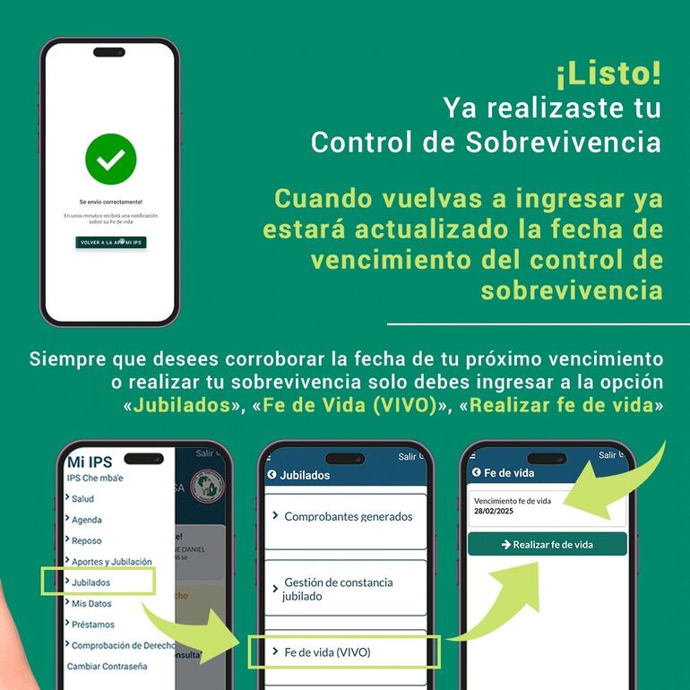 Como dato importante, el IPS resaltó que el control de sobrevivencia debe realizarse cada tres meses, a fin de garantizar el pago continúo de la jubilación o pensión.