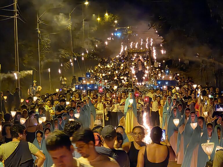Posterior a esto, alrededor de las 19:00, una vez que el sol estaba a punto de su puesta, inició la procesión de la Virgen Dolorosa desde la quinta “La Gloria”, por el Yvaga Rapé, que fue iluminado por más de 20.000 candiles y 400 antorchas.