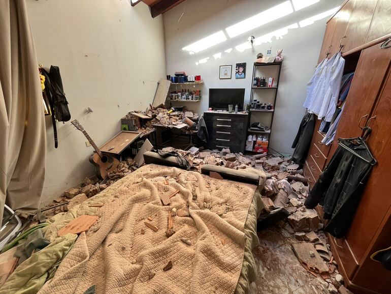 Según se pueden observar en las imágenes, la mayor parte de los escombros cayeron sobre dos sillones, alcanzó la cama y todo lo que está alrededor. “Los daños materiales son cuantiosos, pero lógicamente eso se puede recuperar”.