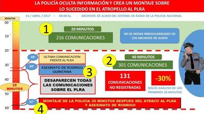 Un total de 131 comunicaciones de la Policía Nacional, en el lapso de 40 minutos, anteriores y posteriores al atraco a la sede del Partido Liberal fueron borradas. El abogado Guillermo Duarte, defensor de la familia de Rodrigo Quintana, detalló que esos datos fueron detectados tras un análisis hecho por ellos mismos y que arrojó tres principales indicios para afirmar la “desaparición” de esas comunicaciones.