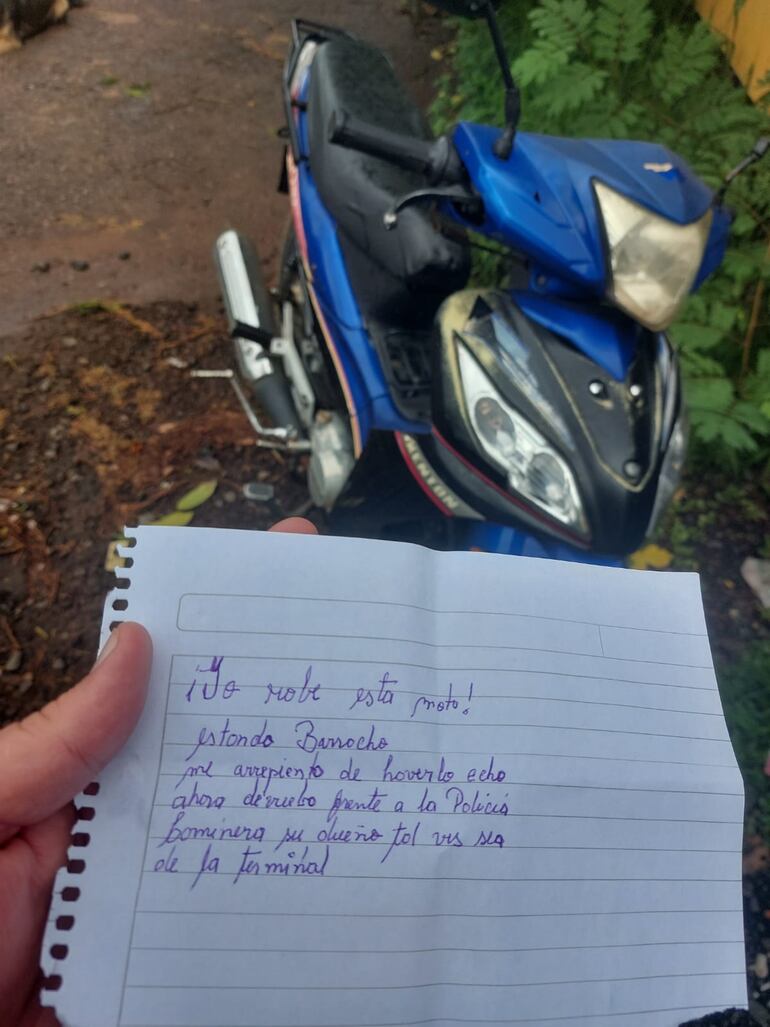 “¡Yo robe esta moto! estando borracho me arrepiento de haberlo echo (sic) ahora devuelvo frente a la Policía Caminera su dueño tal vez sea de la Terminal”, indica este papel que tiene errores y habría sido escrito por el ladrón, quien aseguraba estar borracho cuando cometió el delito.