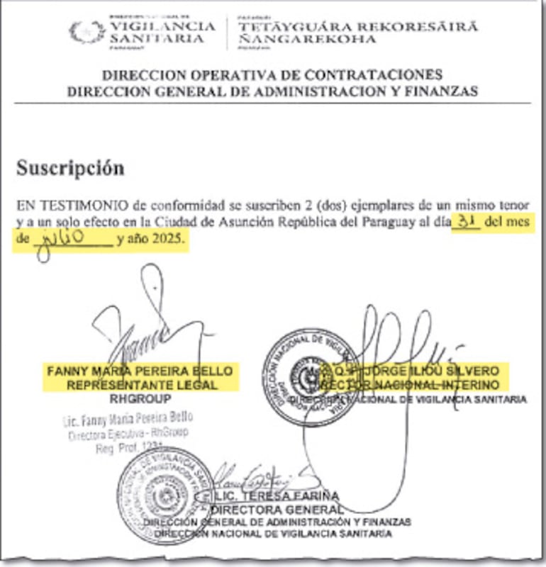 La Dirección Nacional de Vigilancia Sanitaria (Dinavisa), a cargo de Jorge Iliou Silvero, adjudicó a la empresa RH Group, representada por Fanny María Pereira Bello, un contrato por hasta G. 3.000 millones para la tercerización de 45 profesionales técnicos y administrativos, según la web de la Dirección Nacional de Contrataciones Públicas (DNCP).